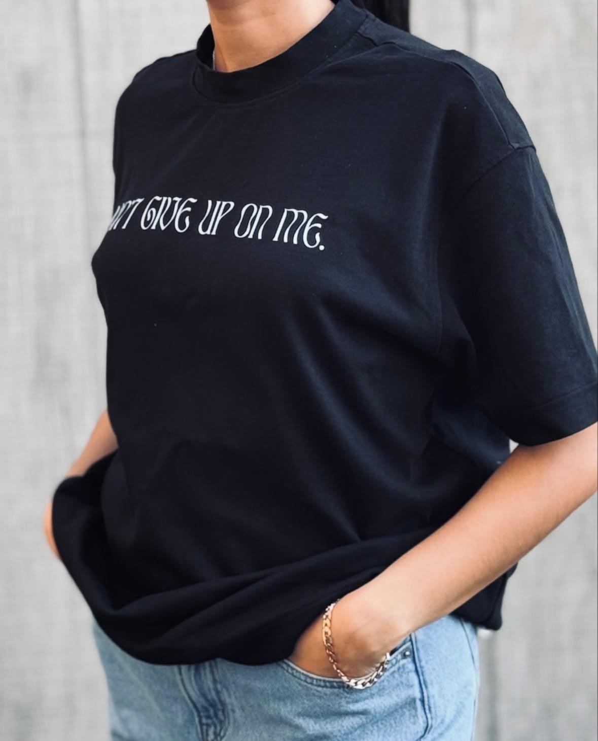 The front features the phrase “Don’t give up on me.” — a powerful declaration of surrender and hope.